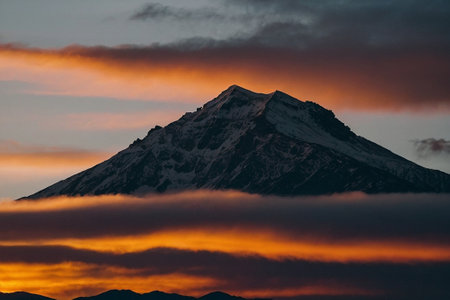 Experience the serene beauty of a majestic mountain peak draped in soft clouds at dusk. The light casts enchanting shadows on the snow-covered summit, inviting adventure.