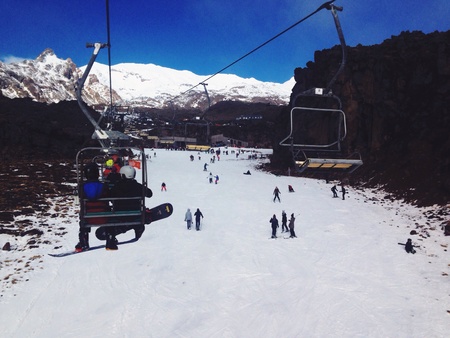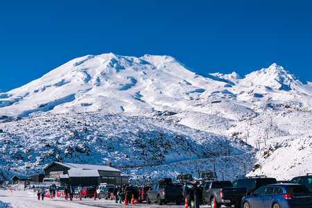 Busy ski resort in winter mountains. Turoa ski field at Mt Ruapehu, New Zealand. Beautiful mountains and the blue sky, winter landscape.