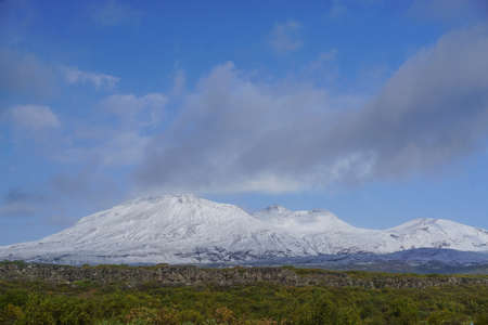 Thingvellir National Park, Iceland: Rift valley wall and snow-covered mountains in the distance.