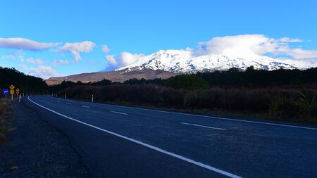 A mountain highway leading towards snow capped peaks of Mt Ruapehu and Mt Ngauruhoe. Tongariro National Park, New Zealand.