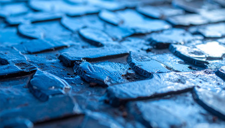 Detailed view of a wet pavement surface, showcasing the intricate pattern of the pavement and the vibrant yellow and blue painted lines. Water droplets cling to the surface, creating a glistening effect.