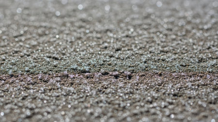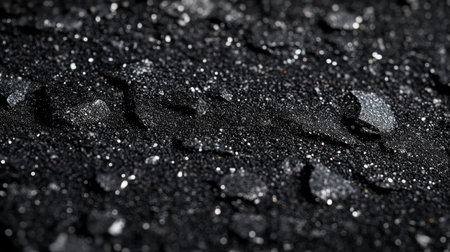 A close-up view of black sand with sparkling grains and reflective particles, creating a dynamic and textured surface under light.