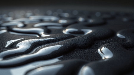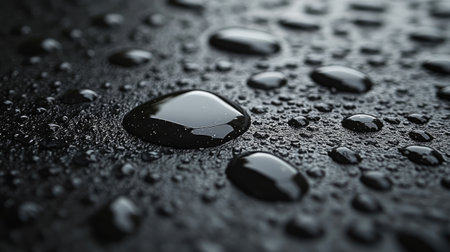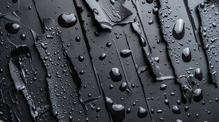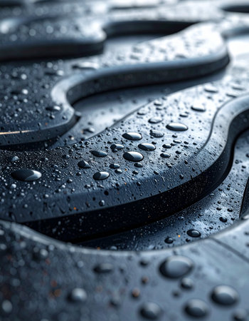 A macro perspective reveals the intricate details of a dark, industrial surface beaded with fresh raindrops.
