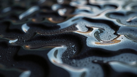 Abstract hammered metal texture with droplets, black-gray tones, corrosion-resistant surface for industrial design