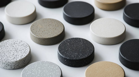 A collection of different colored and textured ceramic tiles. The tiles are arranged in a pattern, with some overlapping and others standing alone. Scene is one of variety and contrast