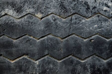 A close up of a tire with a black and gray color. The tire is dirty and has a worn out appearance