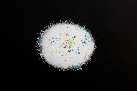 Microplastic particles in salt on black background. Water pollution. Microplastic problem. Threat to human health and the environment. Dangerous additives. Toxic substances.