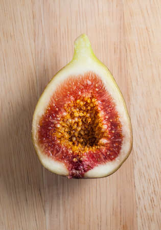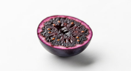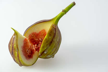 Half of a juicy ripe fig with seeds on a white background. Seeds in a close-up section