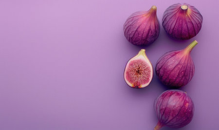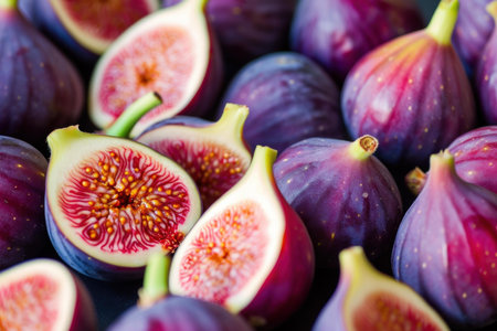 Clusters of fresh figs are displayed, featuring whole and sliced pieces. The vibrant colors and textures highlight their natural sweetness and are perfect for various dishes or snacks.