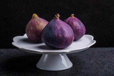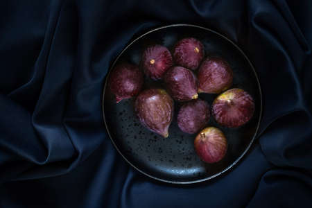 Fresh figs on black background. Beautiful blue violet figs with empty copyspace close up