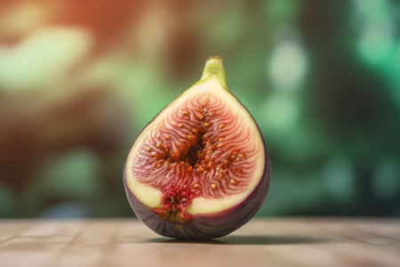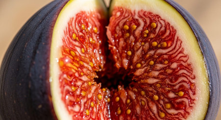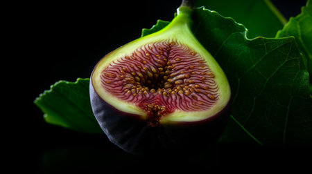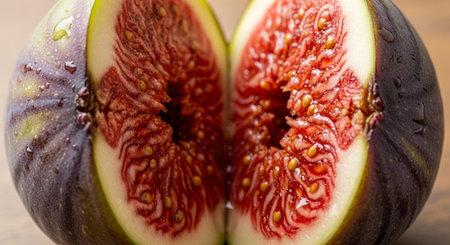 Photo of Photorealistic close-up of a halved fig, revealing its jammy interior with tiny seeds, on a bed of fresh green leaves with a solid, light brown background. , photorealistic, hyperrealistic --ar 2:3 Job ID: 5384a95e-3b84-4824-903a-d646bdc84a42