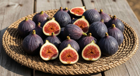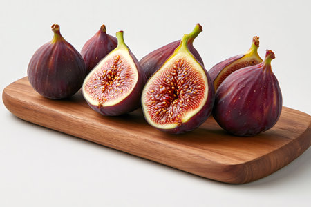 Ripe figs, both whole and cut in half, showcasing their vibrant color and juicy texture, arranged on a wooden board