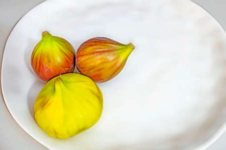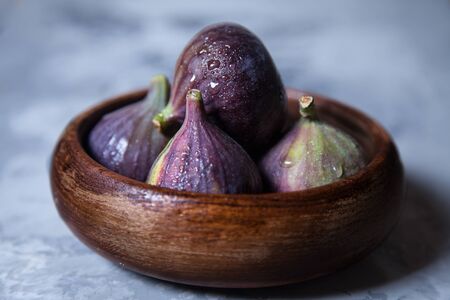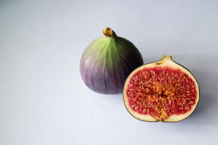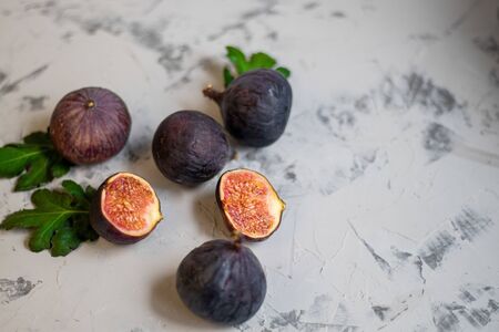 Ripe, beautiful, purple figs. Sweet and juicy. Mediterranean fruit is very healthy. On a light gray background copyspace there is an empty place. Food for vegetarians.