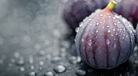 A single ripe fig, covered in glistening water droplets, rests on a dark surface, highlighting its rich purple color and textured skin, suggesting freshness and vitality.