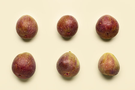 Overhead view of whole and cut ripe figs showcasing their natural pattern and vibrant interior