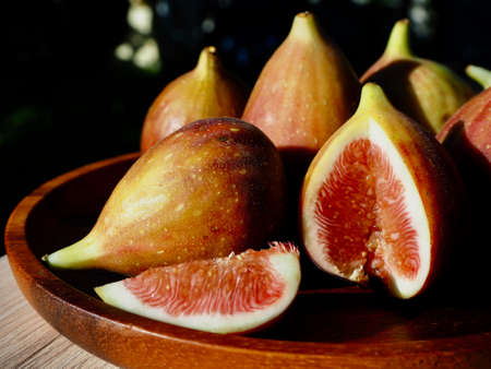 Ripe halves of figs in a plate and whole figs around on a light wooden table close-up. Healthy fresh vegan raw organic food