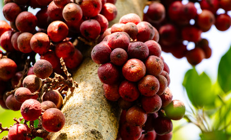 Vibrant images of ripe red cluster figs hanging from the tree, showcasing their rich color and natural abundance. Perfect for nature, agriculture.