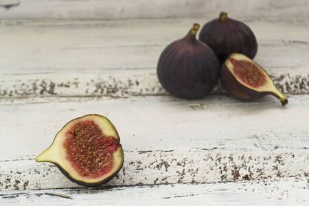 Three fresh figs on a wooden white table. One fig is cut in halves and its flesh is visible. Located in a group. The concept of urge.