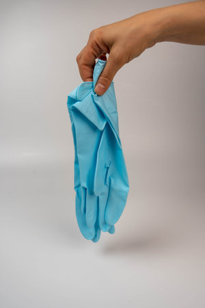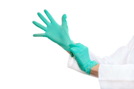 Female hand in a colored rubber glove. Isolate on white background. The concept of the work of a cook in a restaurant or a doctor