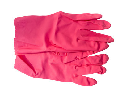 A high angle shot of a pair of pink cleaning gloves on a white surface