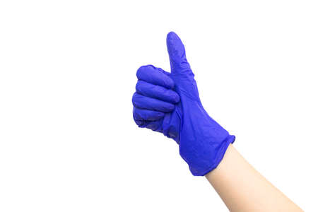 Close up of female doctor's hand in blue sterilized surgical glove showing thumbs up sign against white background