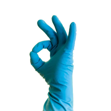 A hand in a blue medical glove shows an OK sign on a blue medical background with space for text. copy space