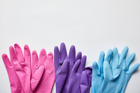 Cleaning rag in various colors and white rubber gloves on white background. Towels day