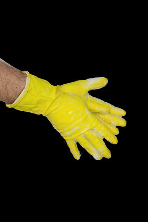 Closeup of male hands with yellow rubber gloves in front of black background. Wash your hands with warm water and soap.