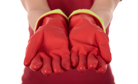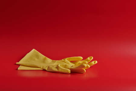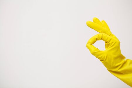 Woman is wearing yellow rubber glove. Isolated symbol of good cleaning service or using protective gloves while cleaning.