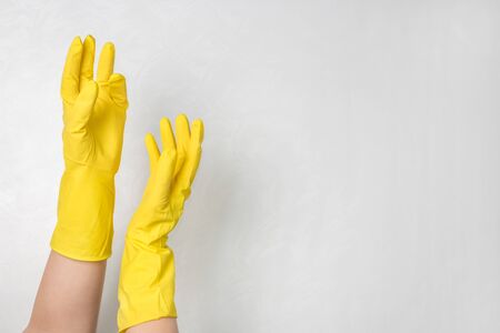 House cleaning concept. Female hands wear yellow rubber gloves for cleaning form a space on gray background
