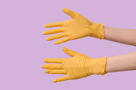 Hands of a man wearing gloves. Dressed in a blue shirt face is not seen in the shot. Yellow background studio.