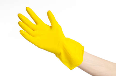 Homework, washing and cleaning of the theme: man's hand holding a yellow and wears rubber gloves for cleaning isolated on white background