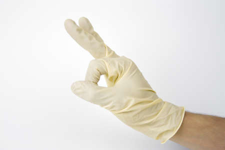 Man's hand with nitrile gloves for medicine making gesture of peace and love. isolated on white background.