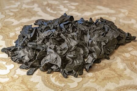 Big pile of thin blue medical latex gloves on light background. Disposable rubber medical gloves. Protective subjects. Remedies. Close-up. Selective focus. Copy space.