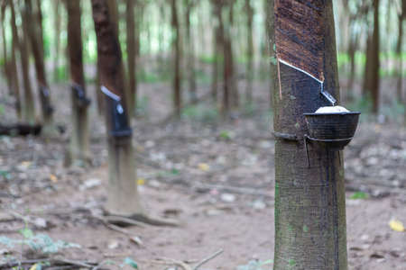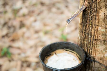 Rubber latex extracted from a rubber tree into a bowl, Thailand.