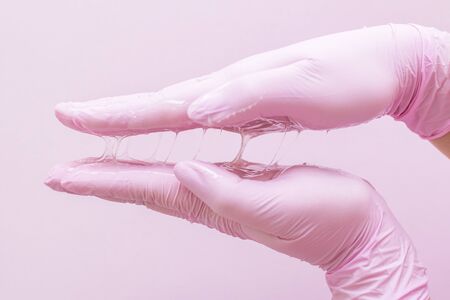 sugar for depilation in hands in pink gloves on a pink background. The concept of depilation, shugaring, smooth skin.