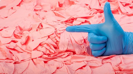 Hand in new blue latex medical glove on background of a lot pink rubber gloves