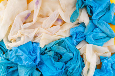 Lot of protection elastic surgical gloves white, black and blue colors. Flat lay close-up view of hygiene and protective gloves of hospital medical staff during pandemic outbreak, quarantine.