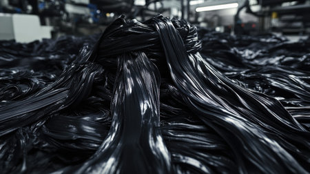 Captivating close-up of a glossy black substance flowing through an industrial setting, showcasing intricate textures, smooth lines, and soft reflections that highlight the material's unique characteristics.