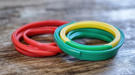 A close-up view of colorful rubber bands in red, green, and yellow, arranged thoughtfully on a rustic wooden surface, ideal for organizational use in various projects.