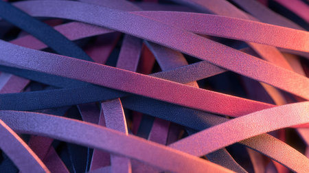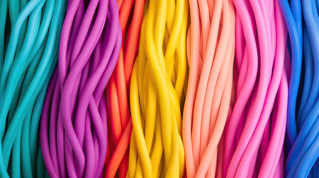 A stunning display of colorful rubber cords in vibrant shades providing a playful and artistic visual. This abstract image showcases smooth lines and dynamic texture.