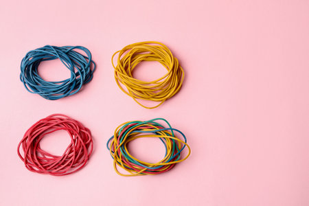 Many colorful rubber bands on pink background, flat lay. Space for text