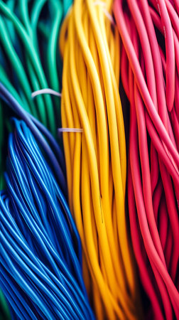 Detailed close-up showcasing bundled electrical wires in vibrant colors blue, green, yellow, and red. The image highlights the textures and arrangements of the cables.