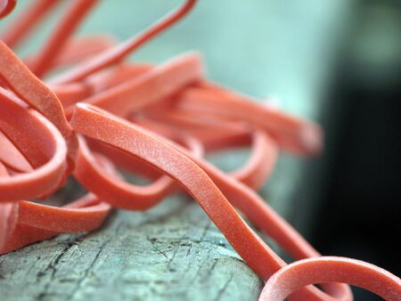 Close-up of colorful rubber bands intertwined, unusual perspective, soft pastel light.