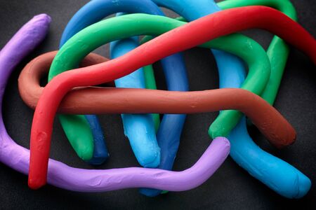 Intertwined strands of vibrant pink, blue, and yellow clay dough create a visually captivating abstract pattern, showing the playful and artistic potential of this versatile material