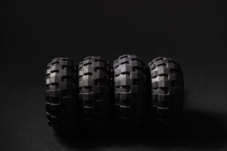 This image showcases a collection of distinct rubber items arranged on a dark textured surface, ideal for abstract design, industrial concepts, and creative projects.