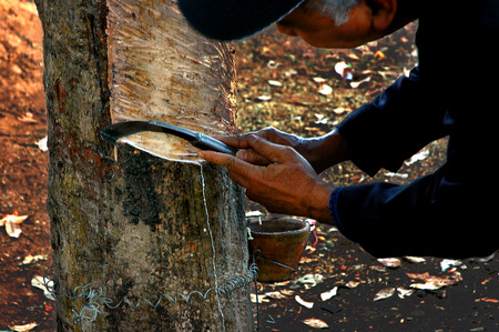 Tapping latex from a rubber tree asia Thailand