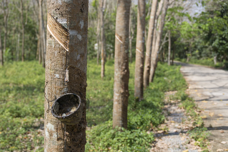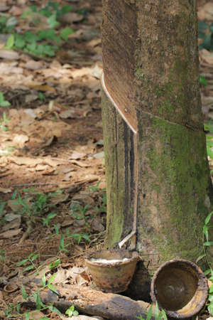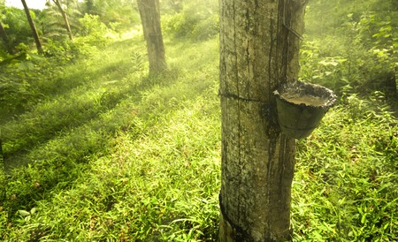 Rubber tree (Hevea brasiliensis) produces latex. By using knife cut at the outer surface of the trunk. Latex like milk Conducted into gloves, condoms, tires, tires and so on.