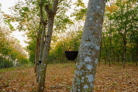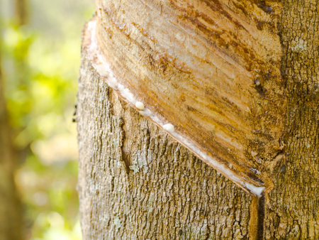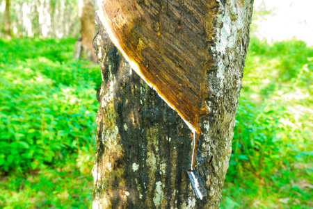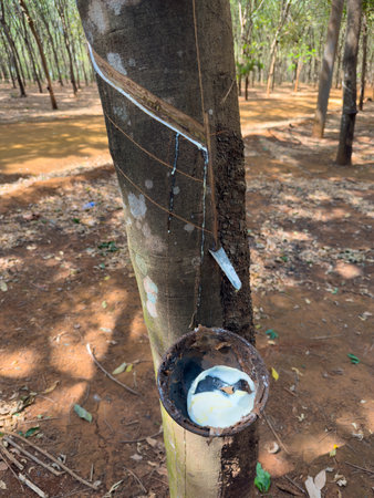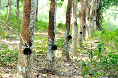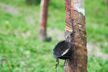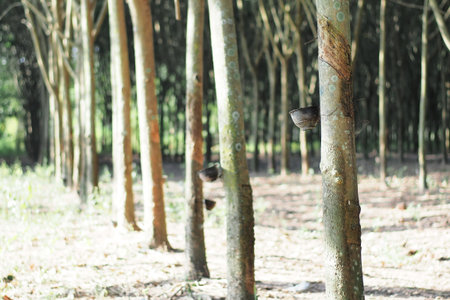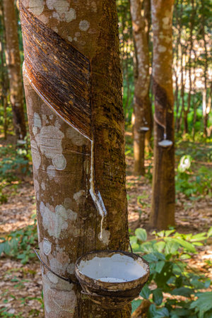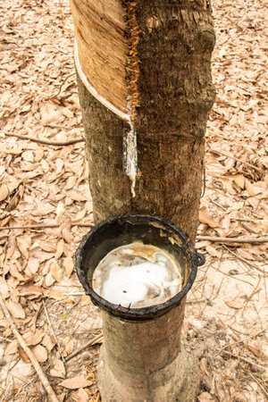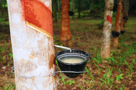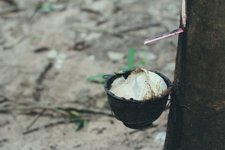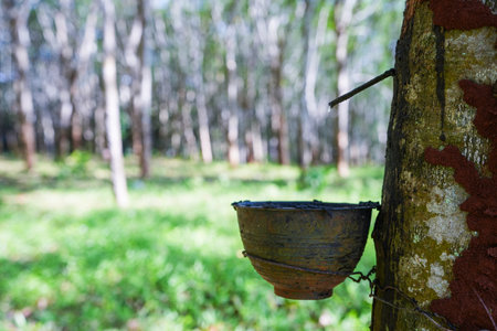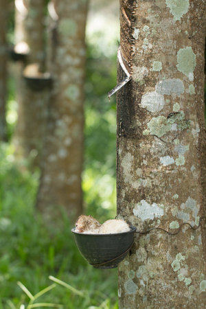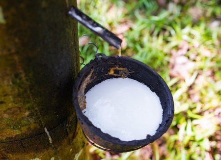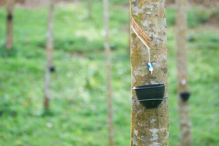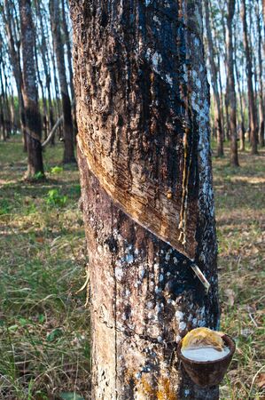 Rubber tree plantation. Milky latex extracted from rubber tree (Hevea Brasiliensis). Selective Focus.
