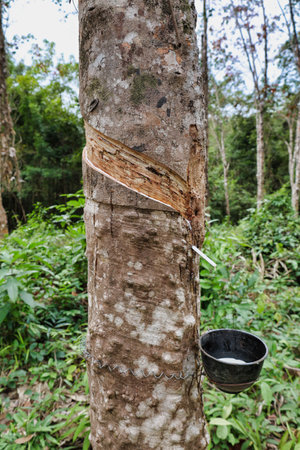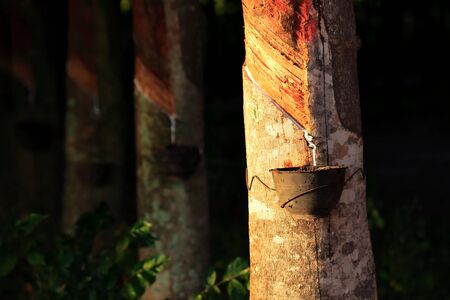 Rubber tapping in rubber tree garden. Natural latex extracted from para rubber plant. Rubber tree plantation. The milky liquid or latex oozes from wound of tree bark. Latex collect in small bucket.